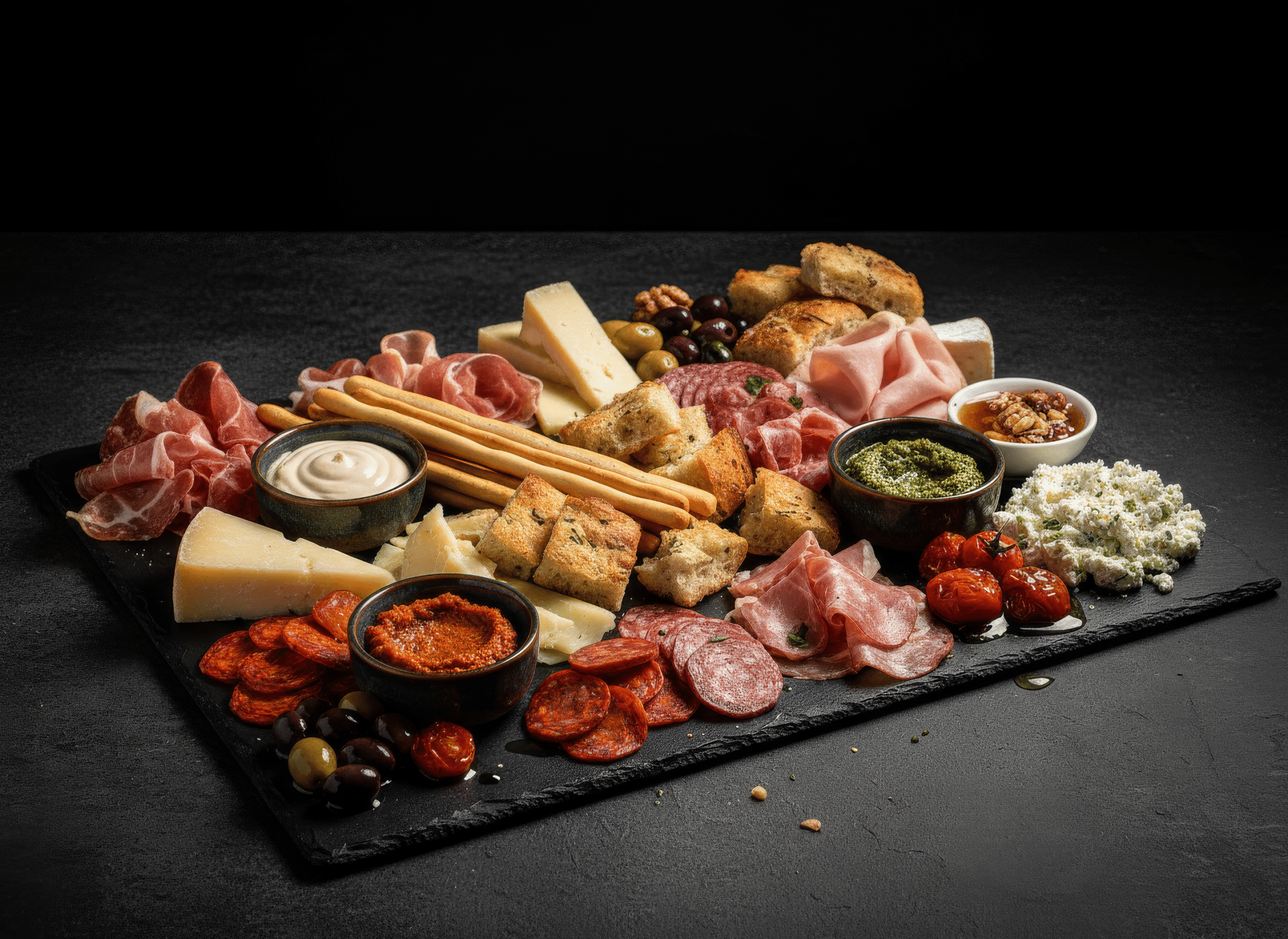 Et utvalg av italiensk spekemat og ost, servert med grissini, crostini og hjemmelagd focaccia – med pesto, tomatpesto, fetaostkrem, confit cherrytomater, urtemarinerte oliven, trøffelmajones og honning med nøtter.