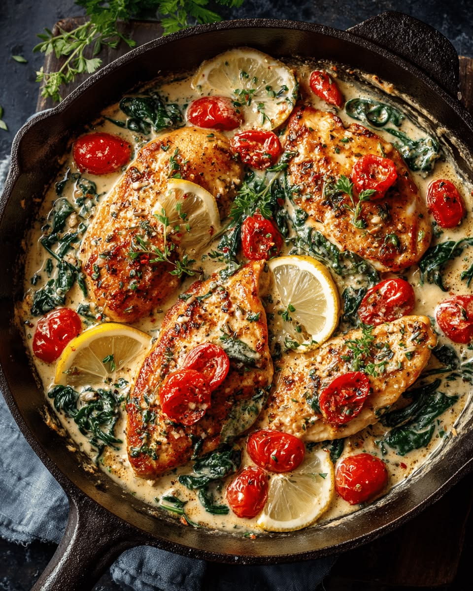 Saftig kylling servert i en silkemyk, kremet parmesansaus med soltørkede tomater og frisk spinat.